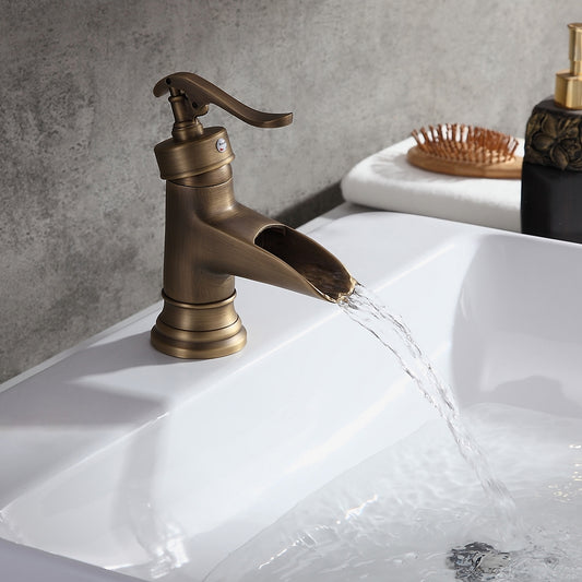Antique Brass Waterfall Sink Faucet – Single Hole Solid Brass Bathroom Tap