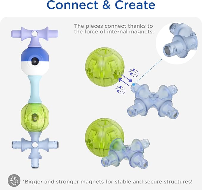 - 100-piece set for limitless creativity, including magnetic shapes, propellers, wheels, and connectors for complex builds.